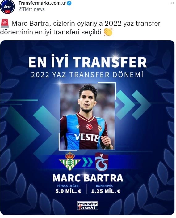 Yapılan anket sonucunda Trabzonspor’un Real Betis’ten transfer ettiği İspanyol yıldız Marc Bartra yaz döneminin Süper Lig’deki en iyi transferi seçildi.